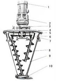1、電機(jī) 2、減速機(jī) 3、噴液裝置 4、筒蓋部分 5、6、7、傳動部分 8、螺桿部分 9、筒體部分 10、出料閥 |