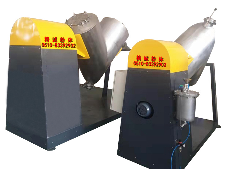 混料筒一般用不銹鋼制作,內外比拋光,結構設計上保證無積料死角,清洗方便徹底。筒體上部有兩個進料口,下部有一個出料口。桶體可用手轉動,以便于出料。另可帶強制攪拌裝置,有利于一些特殊物料的充分混合,或者可以附帶加濕裝置,改善噴霧造粒后的粉體的含水率。