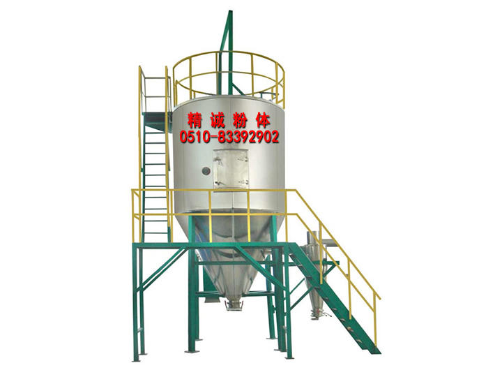 空氣通過過濾器和加熱器,進入干燥器頂部的空氣分配器,熱空氣呈螺旋狀均勻進入干燥器。料液由料液槽經過濾器由泵送至干燥器的離心霧化器,使料液噴成小的霧狀液滴,料液和熱空氣并流接觸水分迅速蒸發,在短時間內干燥為粉末狀成品。成品由干燥塔和旋風分離器排除,廢氣由風機排出。